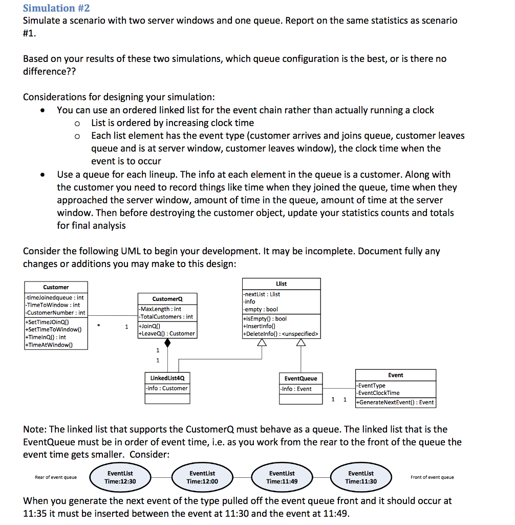 For both simulations you are to do the following: Run the simulation for 6 hours A new customer group arrives every 1 minute t 58 seconds (i.e. as little as 2 seconds apart and as much as 1 min 50 seconds apart A group will consist of 1 to 6 customers following this distribution: o 1 person 30% o 2 people -40% o 3 people 20% o 4 people-5% o 5 people -3% o 6 people 2% Each person in the group joins the queue single file but we can use the same join time for each member of the group. Average serving time for a customer is 2 minutes t 65 seconds. For each simulation below, report on the following: Maximum number of customers served Average number of customers served per window per hour Average wait time in the queue for each customer Maximum wait time in the queue Average queue length for each queue Maximum queue length for each queue Simulation #1 Simulate a scenario with two server windows and two queues. When a group of customers arrive each individual in the group will choose the same queue, but the first individual will choose the shortest queue.