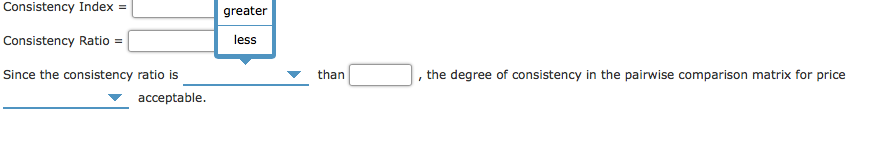 Problem 14-15 (Algorithmic) Use the pairwise comparison matrix for the price criterion as shown in Table 14.8 to verify that the priorities after synthesization for price are 0.080, 0.262, and 0.658. Compute the consistency ratio and comment on its acceptability. Round your answers to three decimal places. Price Accord Saturn Cavalier Accord Saturn Cavalier 4 Amax = Consistency Index = Consistency Ratio =