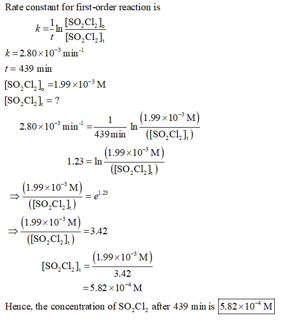 If the initial concentration of SO2Cl2 is 1.99×10-3 M, the concentration of SO2Cl2will be ____M after439min have passed.