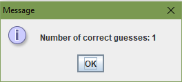 import javax.swing.*; import java.util.*; import java.util.List; public class Main { //create static list witch contain color choices static List<String> choices = new ArrayList<String>(); public static void main(String[] args) { //initialize the list with colors choices.add("red"); choices.add("green"); choices.add("orange"); choices.add("blue"); choices.add("yellow"); int correctGuesses = 0; String input; Scanner keyboard = new Scanner(System.in); // join list for display String colors = String.join(", ", choices); // Play the game for 10 rounds. for (int round = 1; round <= 10; round++) { System.out.print("I'm thinking of a color " + colors + ":"); input = keyboard.next(); //if the user enter wrong color while (!isValidChoice(input)) { System.out.print("Please enter " + colors + ":"); input = keyboard.next(); } //check the computer choice if match then make increment in correctGuesses String computerChoice=computerChoice(); System.out.println("The computer selected : " +computerChoice); if (computerChoice.equalsIgnoreCase(input)) { correctGuesses ++; } } //close scanner keyboard.close(); // show output JOptionPane.showMessageDialog(null,"Number of correct guesses: " + correctGuesses); } /** * Method should return computer choice */ static String computerChoice() { Random random = new Random(); OptionalInt computerChoice = random.ints(0, choices.size() - 1).findFirst(); return choices.get(computerChoice.getAsInt()); } /** * Check if input is contained within list * * @param input * @return */ static boolean isValidChoice(String input) { java.util.Optional<String> val = choices.stream() .filter(e -> e.equals(input.toLowerCase())).findAny(); return val.isPresent(); } }