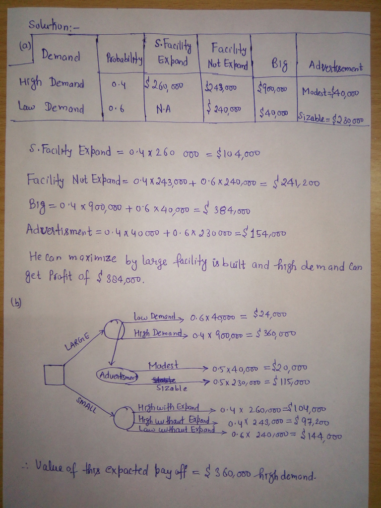 Test: Final Exam Time Remaining: 0221:23 Submit Test This Question: 9 pts 90124 (0 complete) ▼ This Test: 105 pts possible F. J. Brewerton Retailers, Inc., must decide whether to build a smal or a large facility at a new location in Omaha Demand at the location well either be low or high, with probabilities 0 6 and 04, respectivelyM Brewerton builds a small facility and demand proves to be high, he then has the option of expanding the facility If a small facility is built and demand proves to be high, and then the redailer expands the payoff is $260,000. if a small facility is built and demand proves to be high, but Brewerton then decides not to expand the tacility, the payot is $243,000 f a small facility is built and demand proves to be low, then there is no option to expand and the payoffis $240,000. if a large taclity is built and demand proves to be low. Byewerton then has the option of stimulating demand through local advertising If he does not exercise this option, then the payoff is $40,000, it he does exercise the adverssing option, then the response to advertising will ether be modest or sizable, with probablties of 0 5 and 0 5 advertising is needed and the payoft is $900,000 tively i’ the response s modest te payer s t40000·ts stable, the payof is S230000 Finly, talage teltys bullad demand preve, to be high he, no a) What should Brewerton do to maximize his expected paryoftf? Choose the comect decision tree below. Note that all payoffs are in $1,000s OA. ○B. 240 240 low (0 6) ow (0.6) expandー -260 260 Click to select your answers). End